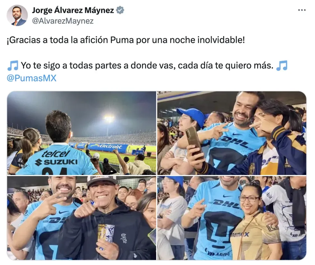 El candidato de Movimiento Ciudadano también es un fiel seguidor del futbol mexicano, en donde apoya a los Pumas de la UNAM, equipo del que porta orgullosamente sus colores; incluso, en plena campaña asistió al Estadio Olímpico Universitario, en donde apareció con su jersey alentado al cuadro del Pedregal.