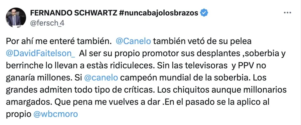 “Por ahí me enteré que Canelo también vetó de su pelea David Faitelson. Al ser su propio promotor sus desplantes ,soberbia y berrinche lo llevan a estas ridiculeces. Sin las televisoras y PPV no ganaría millones. Si Canelo campeón mundial de la soberbia. Los grandes admiten todo tipo de críticas. Los chiquitos aunque millonarios amargados. Que pena me vuelves a dar .En el pasado se la aplico al propio Mauricio Sulaimán”