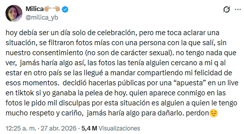 “Hoy debía ser un día solo de celebración, pero me toca aclarar una situación. Se filtraron fotos mías con una persona con la que salí, sin nuestro consentimiento (no son de carácter sexual). No tengo nada que ver, jamás haría algo así, las fotos las tenía alguien cercano a mí que, al estar en otro país, se las llegué a mandar compartiendo mi felicidad de esos momentos. Decidió hacerlas públicas por una ‘apuesta’ en un live en Tiktok si yo ganaba la pelea de hoy. Quien aparece conmigo en las fotos le pido mil disculpas por esta situación es alguien a quien le tengo mucho respeto y cariño, jamás haría algo para dañarlo. Perdón” dijo por medio de su cuenta en X.