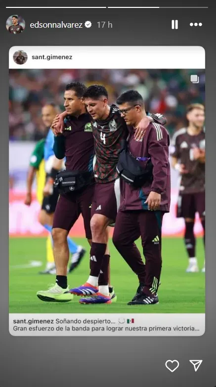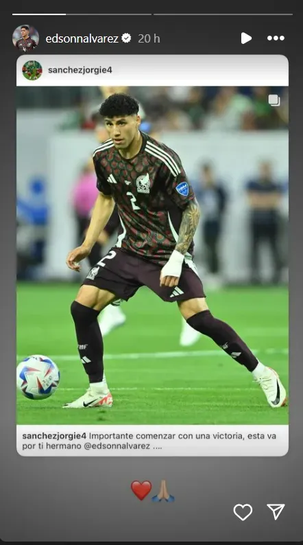 “Importante comenzar con una victoria, esta va por ti hermano Edson Álvarez. Muy contento por mis primeros 90 minutos en un torneo que siempre soñé jugar Gloria a Dios. Vamos México”