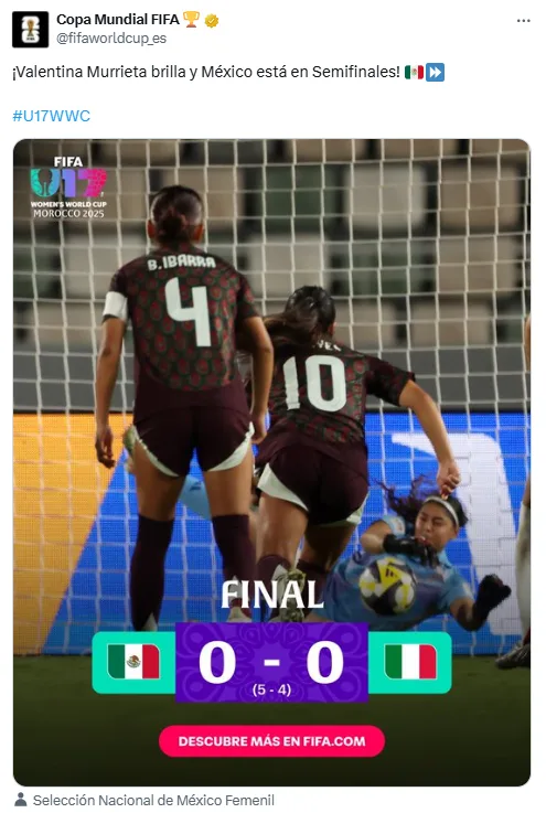 El ‘Tri’, por su parte, convirtió los 5 penales de su tanda, consiguiendo así el boleto a la semifinal de este Mundial Femenino Sub-17, conociendo ya al que será su rival por el puesto en la gran final de la Copa del Mundo.
