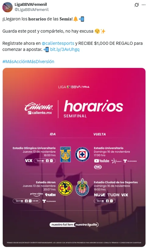 - Transmisión: N+ (NU9VE), TUDN, ViX, Liga BBVA Femenil (Facebook y YouTube)