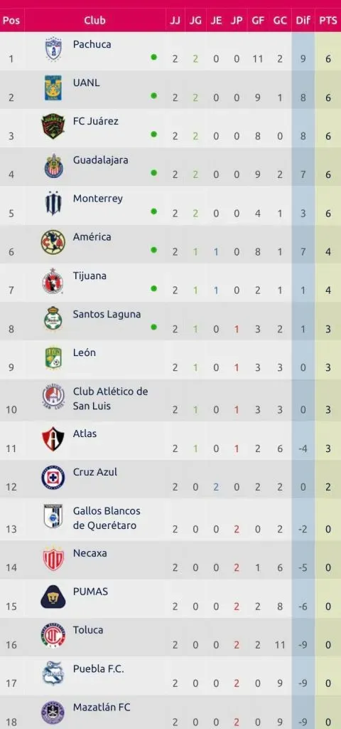 Las Tuzas del Pachuca nuevamente levantan la mano como un contendiente claro al título, esperando que esta ocasión sí lo levanten. El cuadro hidalguense marcha como líder, con seis puntos, misma cantidad que Tigres (2), FC Juárez (3), Chivas (4) y Monterrey (5).