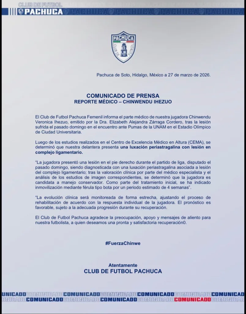 - Pachuca confirmó la baja de Chinwendu Ihezuo por lesión por lo que resta del Clausura 2026.