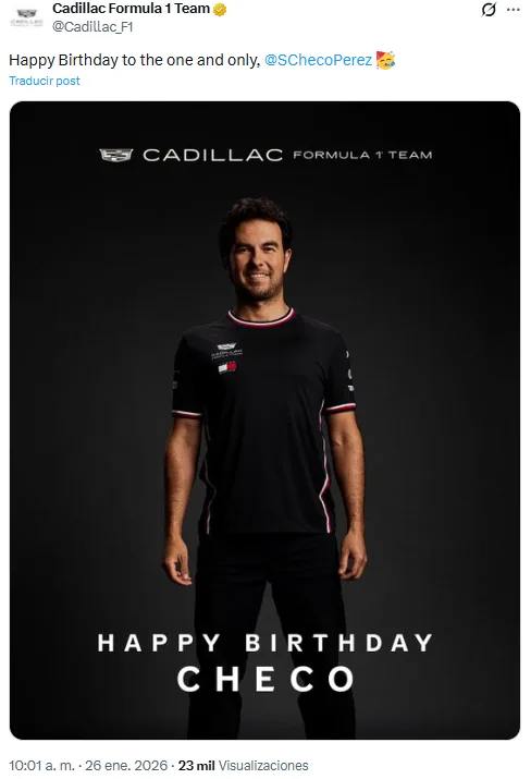EL anuncio de las nuevas playeras coincidió con el cumpleaños número 36 del piloto mexicano. “Feliz cumpleaños al único e inigualable Checo Pérez” dice el mensaje de Cadillac con una imagen del piloto con la nueva indumentaria.