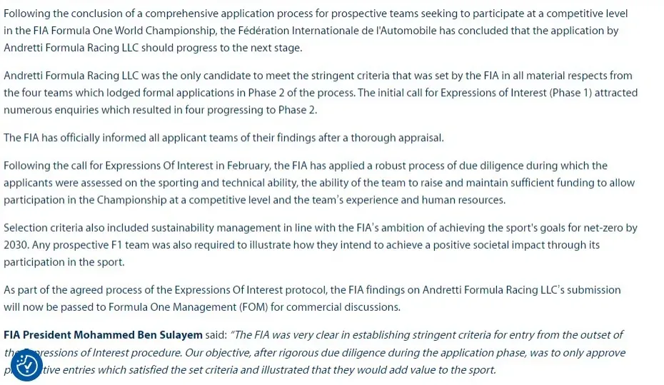 “Para Andretti Cadillac es un honor que la FIA haya aprobado la Manifestación de Interés de Andretti Formula Racing para el Campeonato del Mundo de Fórmula Uno de la FIA”.
