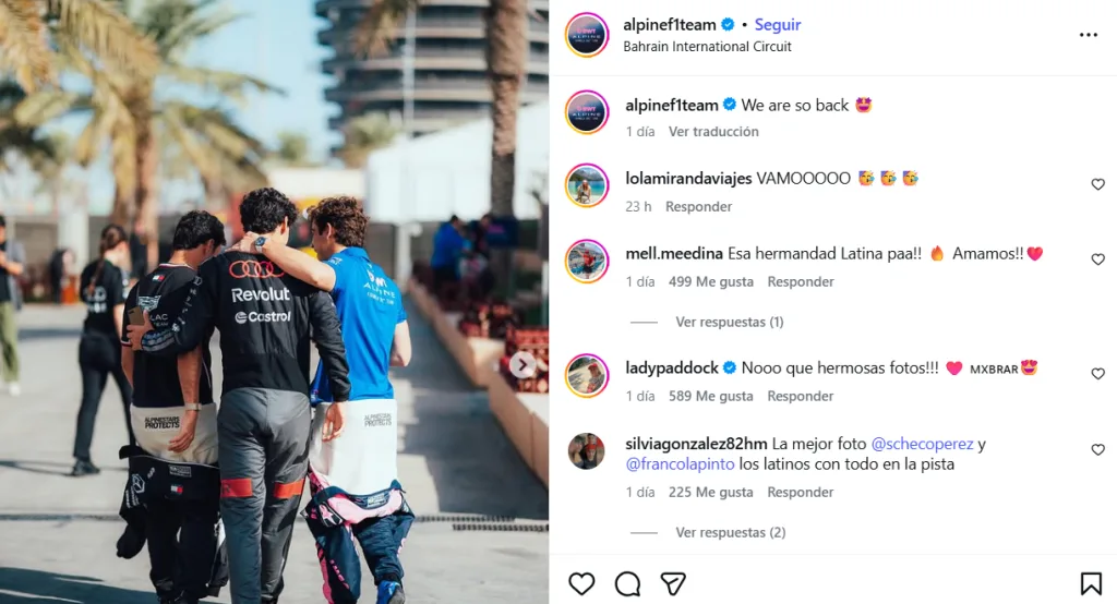 Fue desde la cuenta oficial de Alpine que se publicó la fotografía de Checo Pérez, Franco Colapinto y Gabriel Bortoleto, dejando en evidencia la gran hermandad que existe entre los latinoamericanos de la Fórmula 1.