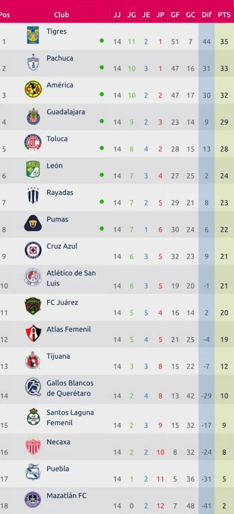Tigres se impuso por 3-0 ante el Puebla, resultado con el que se mantiene en el liderato general con 35 unidades. Las Tuzas del Pachuca, golearon 5-0 al Atlético de San Luis, por lo que son segundas en la tabla con 33 unidades, mientras que el tercer peldaño es para el América, que le remontó a las Rayadas de Monterrey y ahora, suma 32 puntos.
