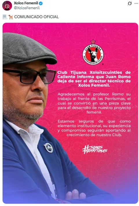 “Club Tijuana Xoloitzcuintles de Caliente informa que Juan Romo deja de ser el director técnico de Xolos Femenil. Agradecemos al profesor Romo su trabajo al frente de las Perrísimas, el cual se convirtió en una pieza clave para el desarrollo de nuestro proyecto femenil. Estamos seguros de que como elemento institucional, su experiencia y compromiso seguirán aportando al crecimiento de nuestro Club” dice el comunicado.
