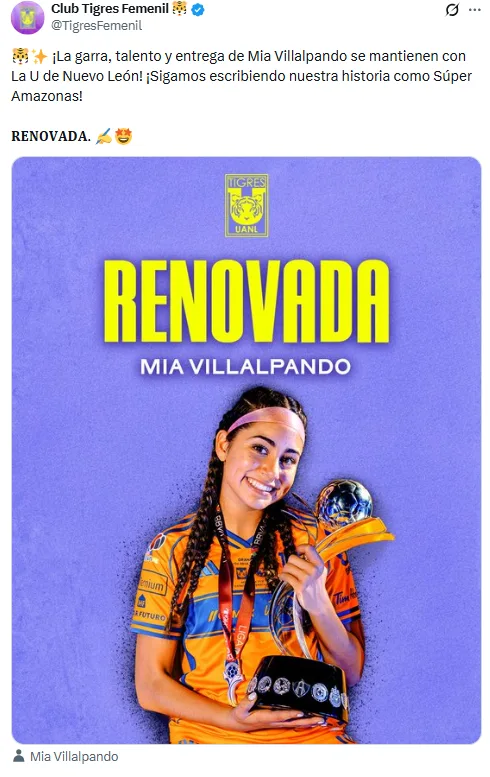 “¡La garra, talento y entrega de Mia Villalpando se mantienen con La U de Nuevo León! ¡Sigamos escribiendo nuestra historia como Súper Amazonas!” dice el anuncio oficial de Tigres Femenil.