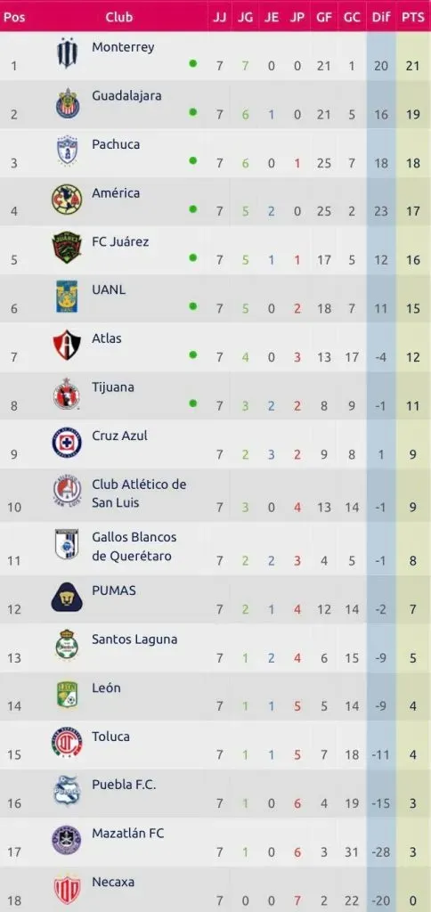 Pero su acérrimo rival no vive el mismo panorama, pues cerraron la séptima fecha cayendo ante Pachuca, algo histórico pues nunca antes habían registrado dos derrotas consecutivas.
