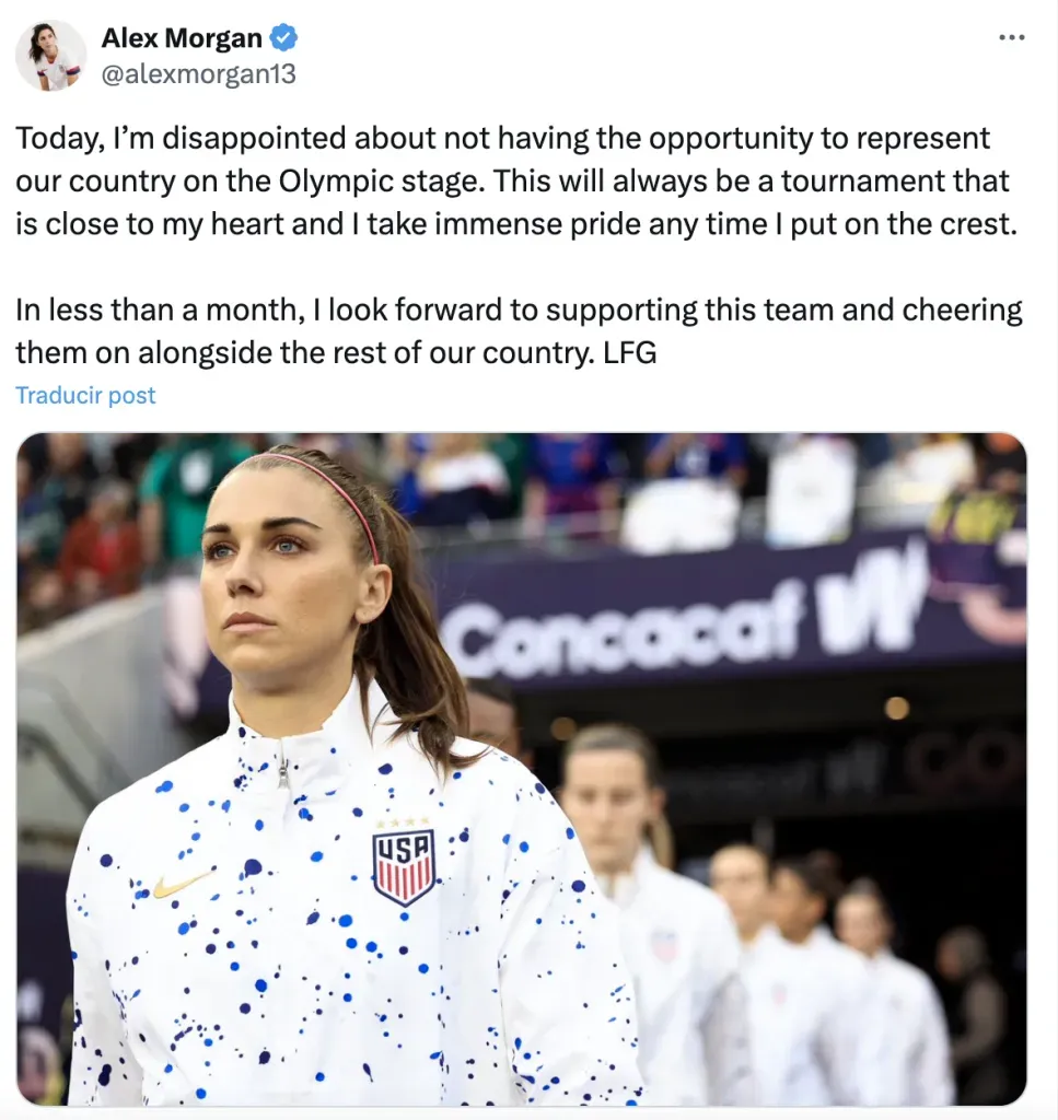 La decisión de haber dejado fuera a Alex Morgan habría sido de la entrenadora Emma Hayes, aunque esta no se comprendió del todo, pues pudo haber tenido no solo calidad con la futbolista, sino experiencia dentro del campo, que muchas veces es lo que una escuadra necesita en un torneo de este tipo.