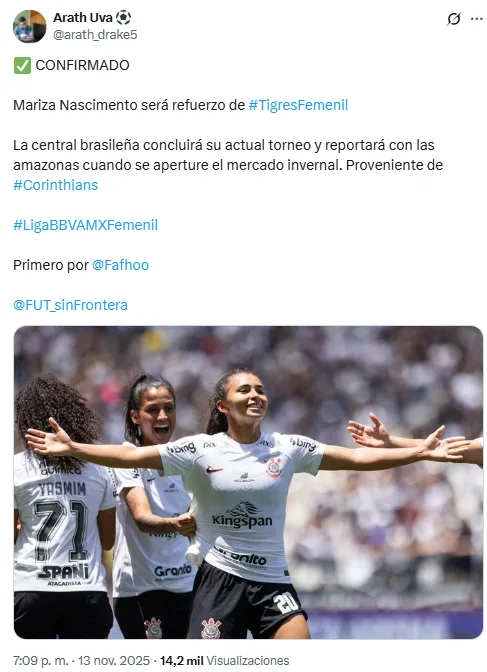 Según informa Arath Uva, Tigres Femenil ha ganado la pulsada por la ficha de la defensora de la Selección de Brasil, Mariza Nascimento. “La central brasileña concluirá su actual torneo y reportará con las amazonas cuando se aperture el mercado invernal. Proveniente de Corinthians“.
