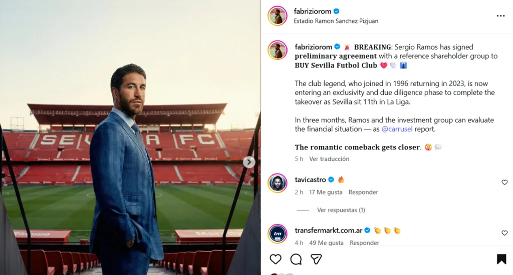 “Sergio Ramos ha firmado acuerdo preliminar con un grupo de accionistas referente para COMPRAR Sevilla Futbol Club. La leyenda del club, que se unió en 1996 y volviendo en 2023, ahora está entrando en una fase de exclusividad y debida diligencia para completar la toma de poder, ya que el Sevilla se sienta 11vo en La Liga” anunció este lunes el periodista Fabrizio Romano.