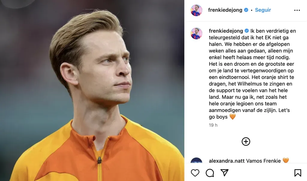 Luego de anunciarse oficialmente su baja, Frenkie de Jong reaccionó en redes sociales, en donde lamentó en lo poder acudir a la Eurocopa 2024, pues tenía altas expectativas sobre dicha competencia y todo lo que podía aportar a los suyos.