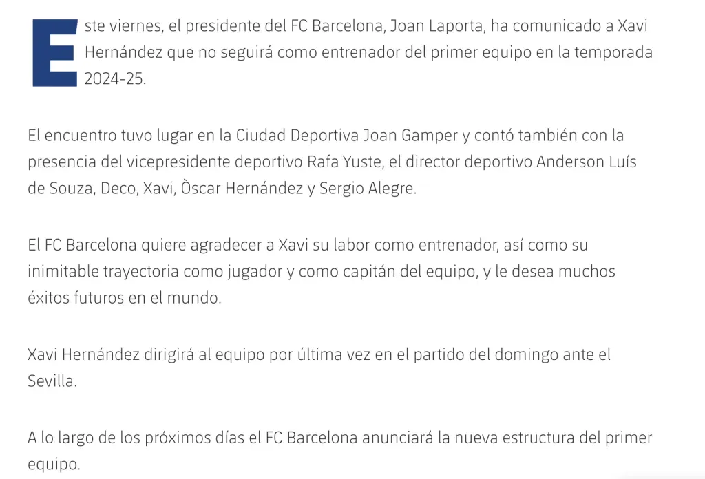 “Queremos agradecer a Xavi su labor como entrenador, así como su inimitable trayectoria como jugador y como capitán del equipo, y le desea muchos éxitos futuros en el mundo. Xavi Hernández dirigirá al equipo por última vez en el partido del domingo ante el Sevilla”