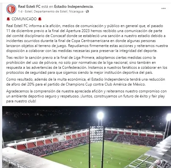 Como resultado, además de una multa económica, el Estadio Independencia tendrá una reducción de aforo del 20% para el partido de la Champions Cup contra Club América de México, se informó en la red social del equipo nicaragüense.