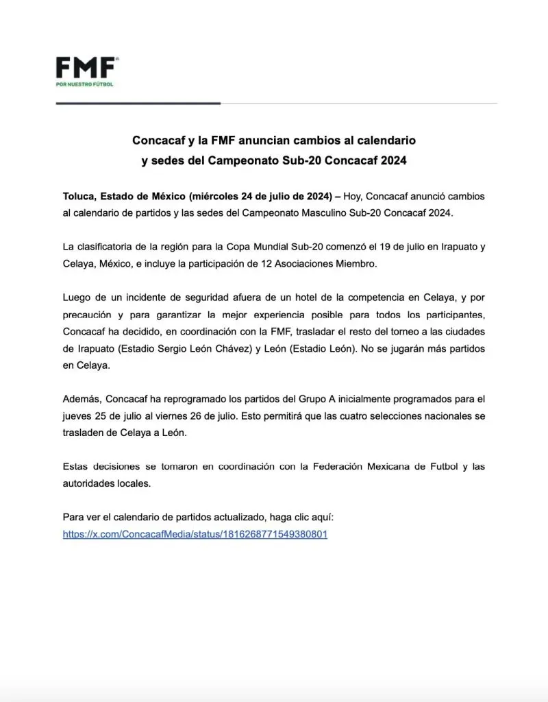 Con esta decisión, Irapuato se mantiene como la sede principal del torneo, mientras que León entra al quite para albergar algunos de los partidos que originalmente estaban programados en Celaya. A pesar de este cambio de planes, el Premundial Sub-20 continúa su curso, aunque con un sabor amargo debido a los hechos ocurridos.