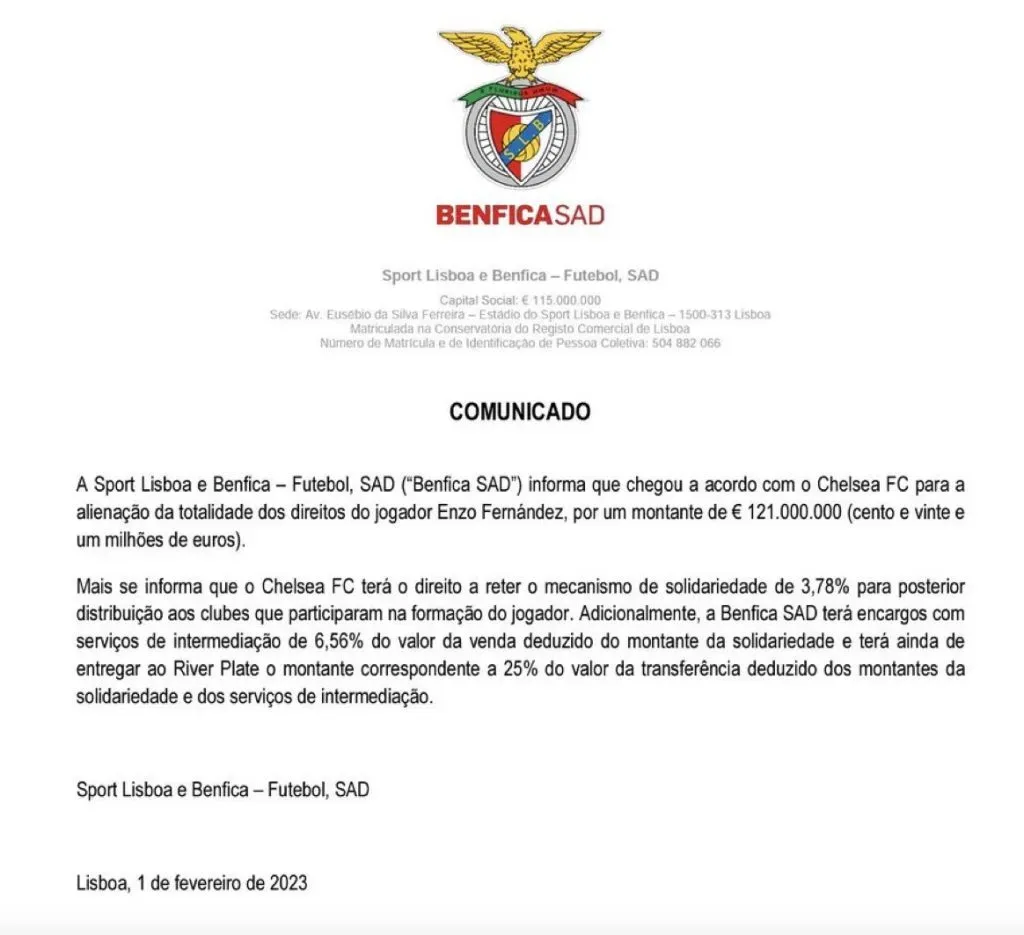 El acuerdo será por las próximas ocho temporadas y media. Además, en este traspaso no solo el Benfica se meterá una buena lana. River Plate también salió ganón, pues mantenía 25% de la carta de Enzo, y de los 121 millones, le tocarán 32. ¡Una locura!