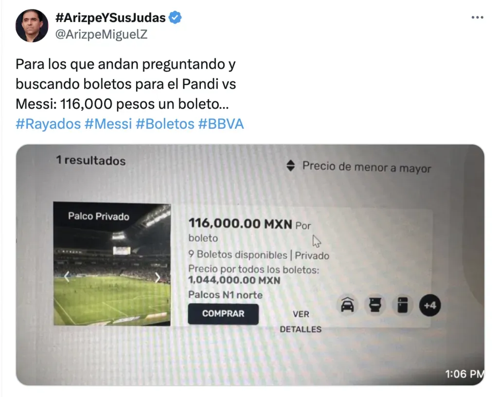Un boleto en palco para el Monterrey vs Inter Miami lo están dando en ¡116 mil pesos! Al palco le caben nueve personas, por lo que si quieres todo el palco para ti, deberás pagar más de un millón de pesos.