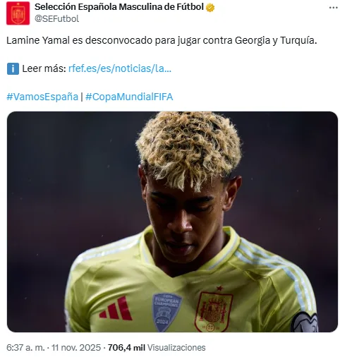 Por medio de un comunicado oficial, la La Selección de España confirmó que Lamine Yamal se cae de la convocatoria para la doble fecha ante Georgia y Turquía por las Eliminatorias al Mundial 2026.