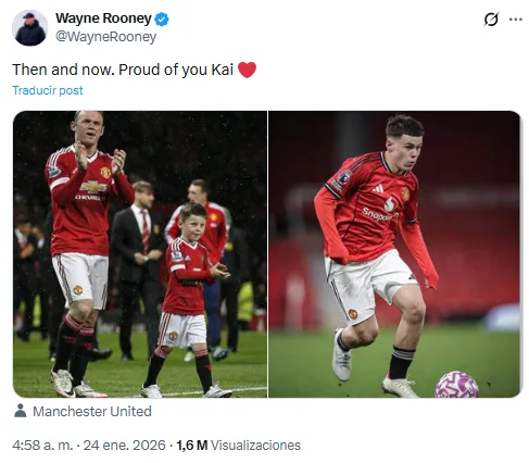 Por medio de sus redes sociales, Wayne Rooney expresó su orgullo por el debut de su hijo en Old Trafford, posteando una vieja fotografía suya en el campo junto a su hijo años atrás, junto con una del debut de Kai. “Antes y después. Orgulloso de ti” dijo le exjugador.