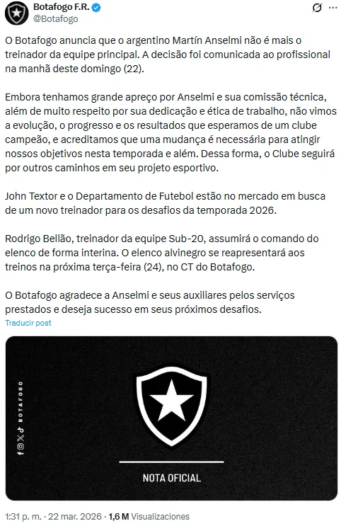 “Si bien apreciamos enormemente a Martín Anselmi y a su cuerpo técnico, y respetamos profundamente su dedicación y ética de trabajo, no hemos visto la evolución, el progreso ni los resultados que esperamos de un club campeón, y creemos que es necesario un cambio para alcanzar nuestros objetivos esta temporada y en las siguientes” dice el comunicado con el que Botafogo despidió a Martín Anselmi.