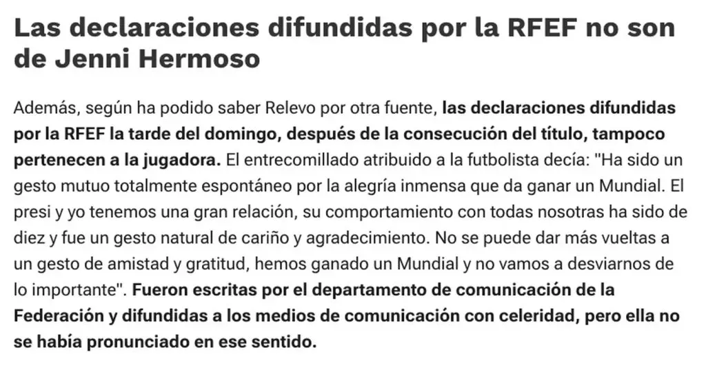 Ha sido un gesto mutuo totalmente espontáneo por la alegría inmensa que da ganar un Mundial. El presi y yo tenemos una gran relación, su comportamiento con todas nosotras ha sido de diez y fue un gesto natural de cariño y agradecimiento. No se puede dar más vueltas a un gesto de amistad y gratitud, hemos ganado un Mundial y no vamos a desviarnos de lo importante” se lee en el texto emitido por el ente español, sin embargo, ya se sabe que todo fue inventado.