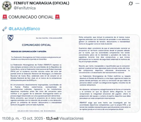 “En circunstancias absolutamente inapropiadas, autoridades de la Fuerza Pública costarricense, acompañados de representantes judiciales, ingresaron a las instalaciones deportivas momentos antes del inicio del encuentro para notificar a un jugador de la selección nicaragüense sobre un proceso legal relacionado con una supuesta pensión alimenticia” dice el comunicado emitido por la Federación Nicaragüense de Futbol.