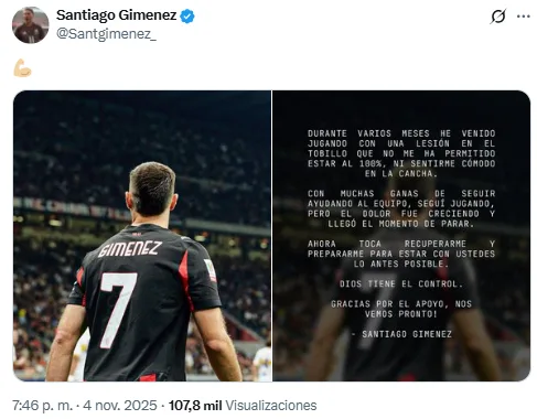 Por medio de sus redes sociales, Santiago Giménez publicó un mensaje que confiesa su lesión en el tobillo, asegurando que este es el motivo de su caída de rendimiento en los partidos más recientes.