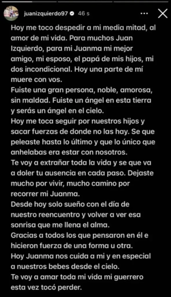 “Hoy me toca despedir a mi media mitad, al amor de mi vida. Para muchos Juan Izquierdo, para mi Juanma mi mejor amigo, mi esposo, el papá de mis hijos, mi dos incondicional. Hoy una parte de mí muere con vos”