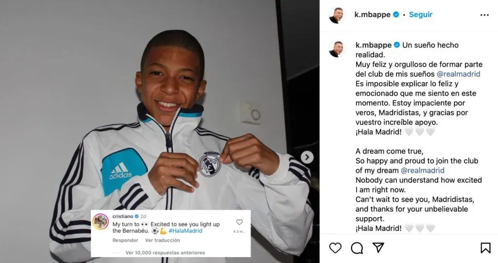 El atacante luso respondió a una publicación del delantero francés, en donde aseguró estar cumpliendo su sueño al llegar con el Real Madrid, publicando una fotografía de él cuando era niño y ya portaba los colores del cuadro español, a lo que Cristiano Ronaldo no dudó en responder.