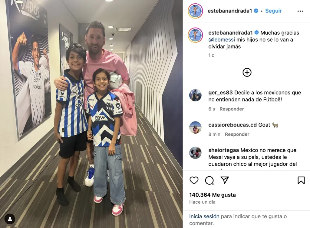 “Muchas gracias, Leo Messi, mis hijos no lo van a olvidar jamás”, fue el mensaje que Esteban Andrada compartió en Instagram, presumiendo la postal de sus dos pequeños, junto al reconocido jugador argentino, quien es considerado uno de los más grandes de la historia.