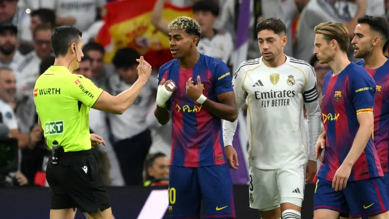 Corrían solo 3 minutos ciando el árbitro principal pitó un penal en favor de Real Madrid luego de una supuesta entrada de Lamine Yamal sobre Vinícius Jr. Sin embargo, el juez fue llamado por los encargados del VAR para revisar la jugada a pie de campo. Desde la pantalla, el colegiado pudo ver que Lamine Yamal punteó el balón antes del impacto con Vinícius, por lo que revirtió su decisión inicial y ordenó la reanudación del partido en el Santiago Bernabéu.