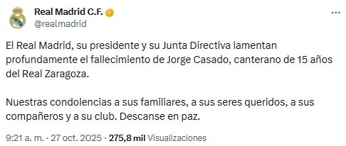 Por medio de sus redes oficiales, la Casa Blanca se pronunció sobre la triste pérdida. “El Real Madrid, su presidente y su Junta Directiva lamentan profundamente el fallecimiento de Jorge Casado, canterano de 15 años del Real Zaragoza. Nuestras condolencias a sus familiares, a sus seres queridos, a sus compañeros y a su club. Descanse en paz“.