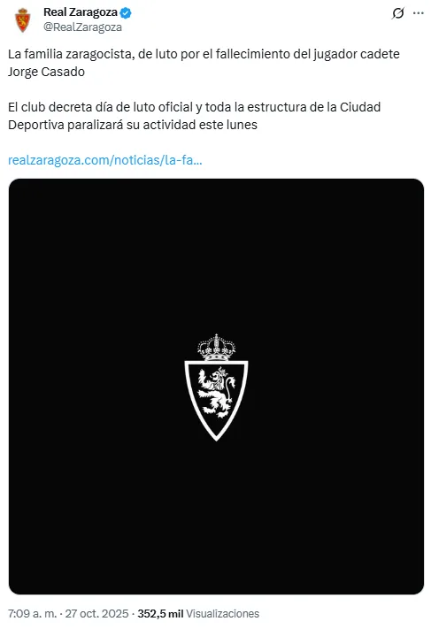 El club, en señal de duelo, suspendió la totalidad de sus actividades en la ciudad deportiva. “La Ciudad Deportiva, devastada ante la trágica noticia, paralizará por completo su actividad y el primer equipo guardará un minuto de silencio antes de su entrenamiento. Desde el Real Zaragoza, consternados por la pérdida, nos unimos al inmenso dolor de la familia y allegados de Jorge. Desde el club enviamos todo nuestro cariño y toda nuestra fuerza en estos momentos tan difíciles. Descansa en paz, Jorge“.