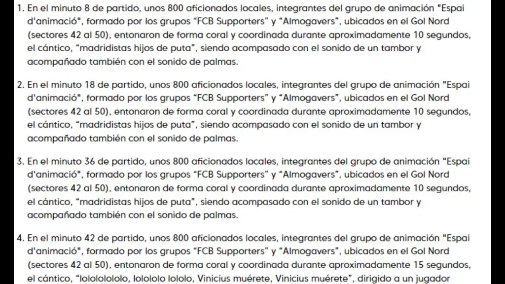 LaLiga, junto al Comité de Competición de la RFEF y la Comisión Antiviolencia sacaron su informe de cada jornada donde destacaron que en el choque de Culés contra Merengues hubo ocho cánticos contra el Madrid y Vini.