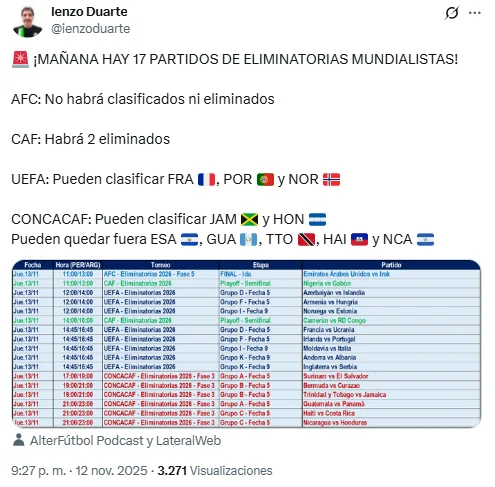 Inicia la última fecha FIFA del año y se vienen partidos decisivos en el proceso de clasificación al Mundial 2026. Este jueves 13 de noviembre será una gran jornada de Eliminatorias Mundialistas, con un total de 5 selecciones con chandes de asegurar su cupo.