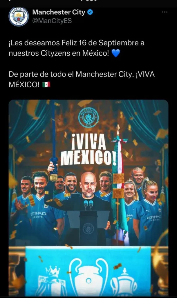 El Manchester City tampoco se quedó atrás, al compartir una imagen que tiene como protagonista a Pep Guardiola, dando el grito y haciendo sonar la campana con la mano derecha.