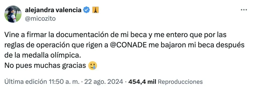 “Vine a firmar la documentación de mi beca y me entero que por las reglas de operación que rigen a @CONADE me bajaron mi beca después de la medalla olímpica. No pues muchas gracias”
