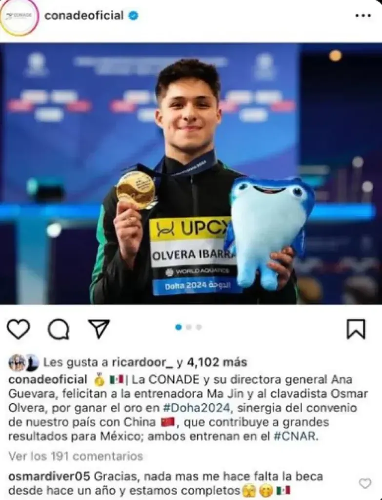 En aquella ocasión, la CONADE se tomó el tiempo de felicitar a Osmar, sin esperar la respuesta del medallista olímpico. “La CONADE y su directora general Ana Guevara, felicitan a la entrenadora Ma Jin y al clavadista Osmar Olvera, por ganar el oro en Doha 2024, sinergia del convenio de nuestro país con China, que contribuye a grandes resultados para México; ambos entrenan en el CNAR“, escribieron en la felicitación para Osmar.