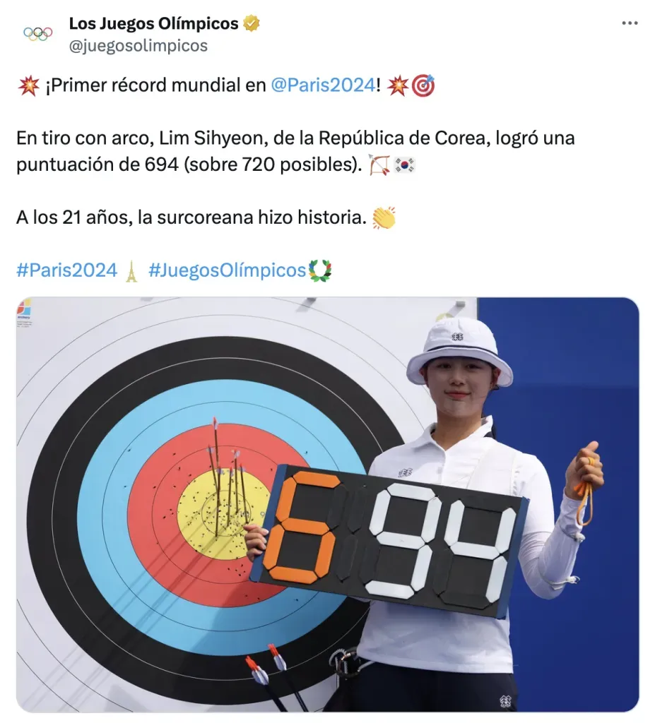 “¡Primer récord mundial en París 2024! En tiro con arco, Lim Sihyeon, de la República de Corea, logró una puntuación de 694 (sobre 720 posibles). A los 21 años, la surcoreana hizo historia“
