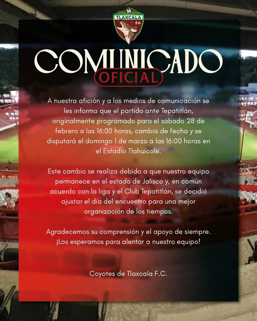 Es por eso que el juego de Tlaxcala vs Tepatitlán no se jugará el próximo sábado. A través de un comunicado, revelaron que se reprogramó para el domingo 1 de marzo a las 16:00 horas (tiempo del centro de México) en el Estadio Tlahuicole.