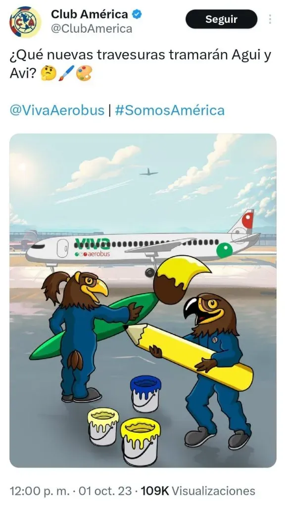 Eso sí, en su cuenta de Twitter, los de Coapa hicieron una muy particular publicación donde comparten una caricatura en la que se ven dos águilas pintando un avión y una leyenda que dice textualmente: “¿Qué nuevas aventuras tomarán las Agui y Avi?”