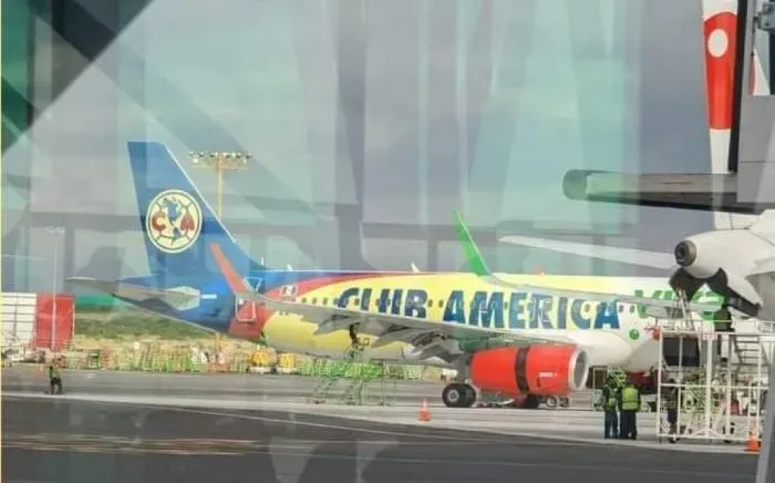 La nave es majestuosa, con su exterior pintado con los colores de las águilas; también se deja ver uno de los fuertes patrocinadores del cuadro capitalino, Viva Aerobus, dueño de la aeronave.