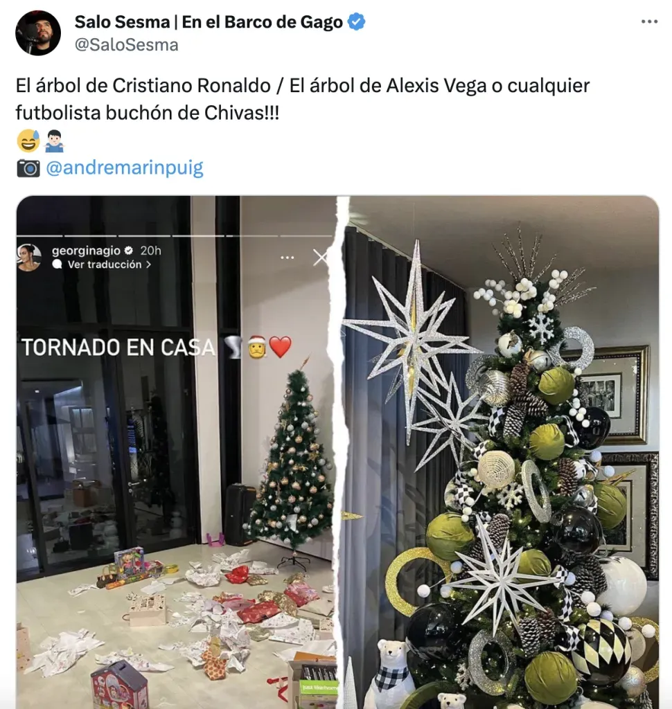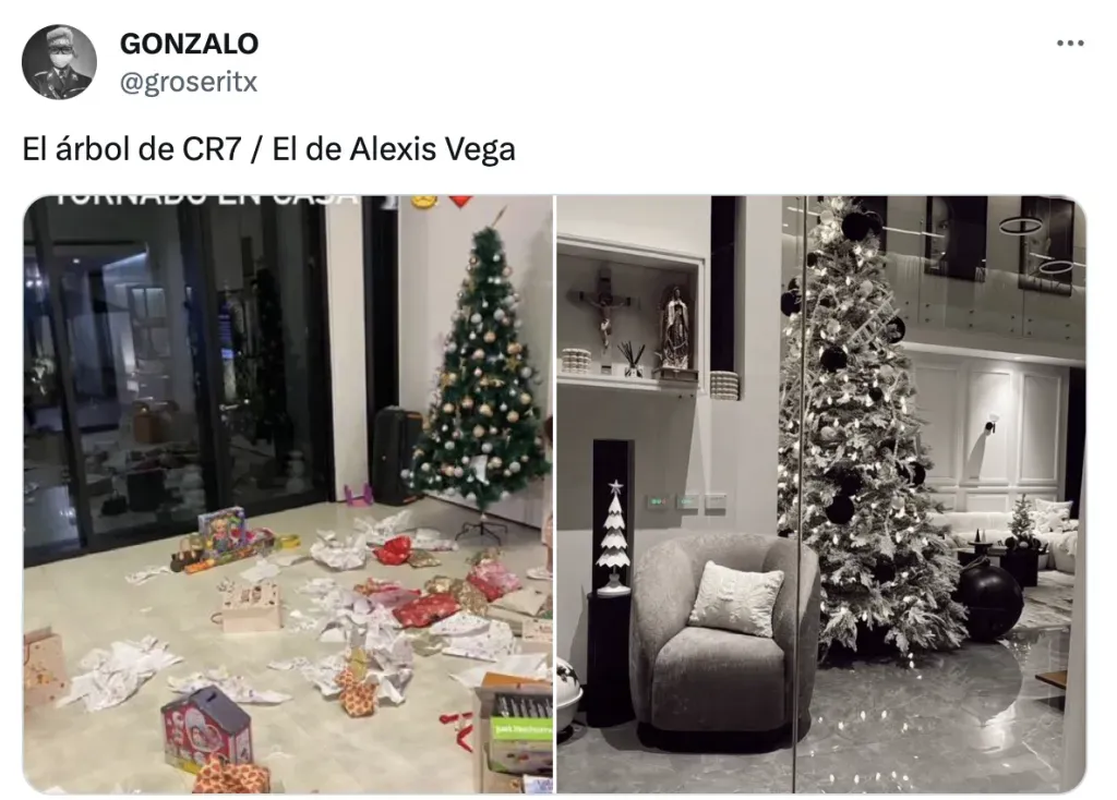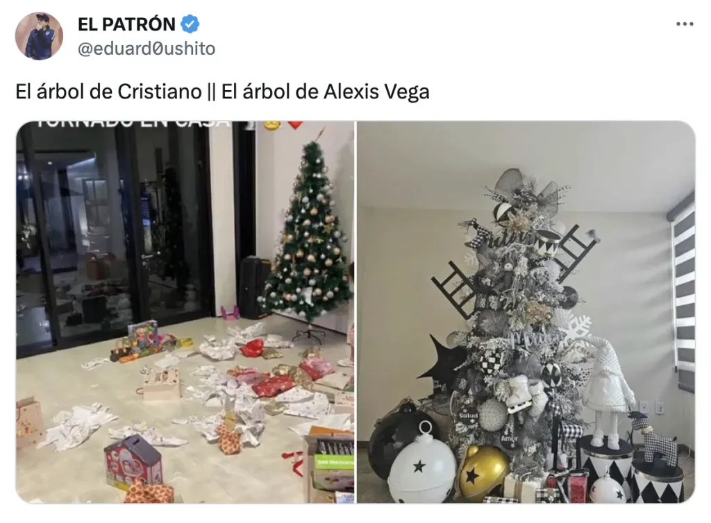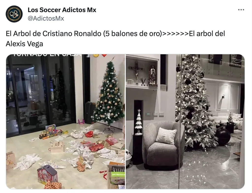 Y fue a partir de ahí que comenzaron la comparación, pues usuarios señalan que Cristiano Ronaldo, quien es uno de los mejores jugadores del mundo, tiene un árbol de Navidad pequeño, mientras que Alexis Vega, jugador de Chivas, tiene todo lo contrario, por lo que las burlas no se hicieron esperar.