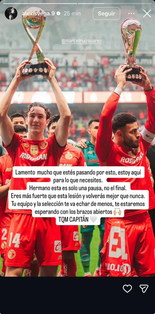Marcel Ruiz se enfrenta a uno de los momentos más complicados de su vida deportiva tras confirmarse la gravedad de su lesión. Y mientras su participación en el Mundial 2026 está en duda, ya recibió varias muestras de apoyo, entre ellos, el de Alexis Vega, su compañero en Toluca y en la Selección Mexicana, quien le mandó un emotivo mensaje.