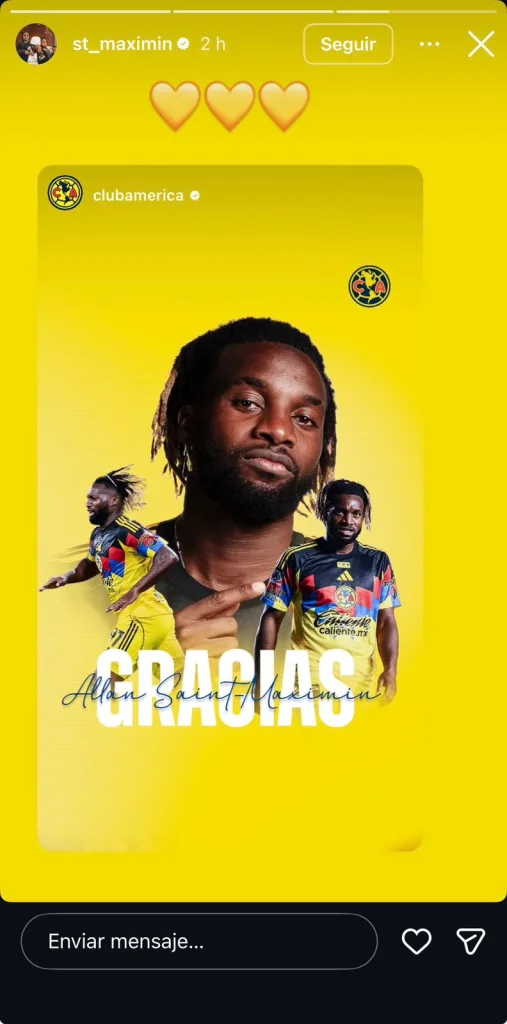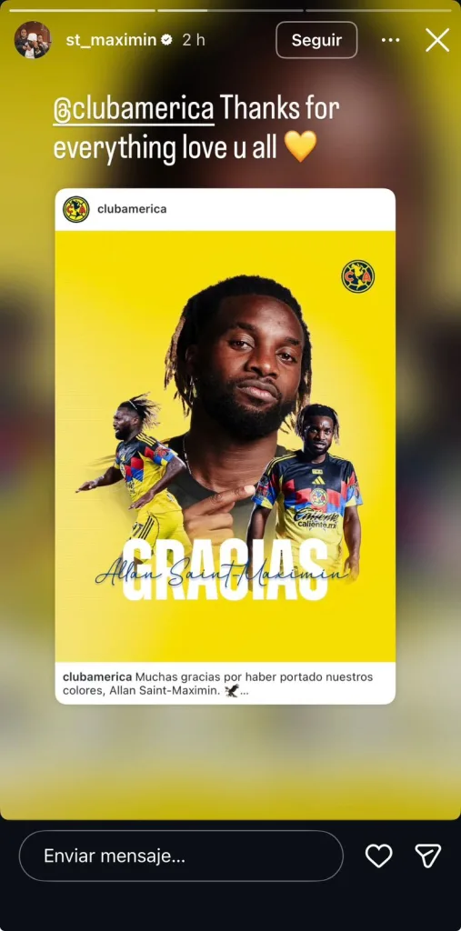 Apenas unas horas después de que América hizo oficial la baja de Allan Saint-Maximin, el extremo izquierdo compartió unas historias en su Instagram. En ellas, dejó claro su sentir tras dejar de ser jugador del conjunto emplumado.