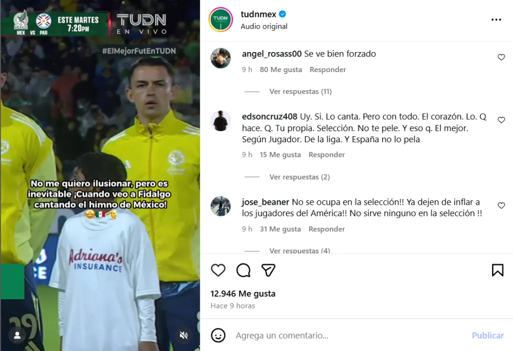 Ante este gesto, muchos usuarios lanzaron comentarios de todo tipo, pero en su mayoría fueron en contra del futbolista de las Águilas del América. Pues aseguraban que Fidalgo no mostraba efusividad a la hora de cantar el Himno de México. Otros señalaron que no hacía falta en la Selección Mexicana como lo han hecho diversos personajes las últimas semanas.