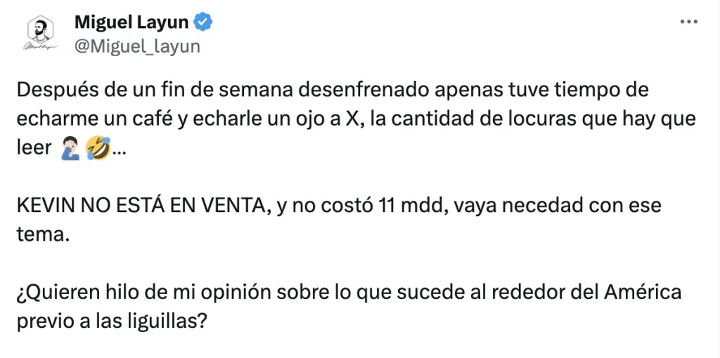 “Después de un fin de semana desenfrenado apenas tuve tiempo de echarme un café y echarle un ojo a X, la cantidad de locuras que hay que leer… KEVIN NO ESTÁ EN VENTA, y no costó 11 mdd, vaya necedad con ese tema. ¿Quieren hilo de mi opinión sobre lo que sucede al rededor del América previo a las liguillas?”